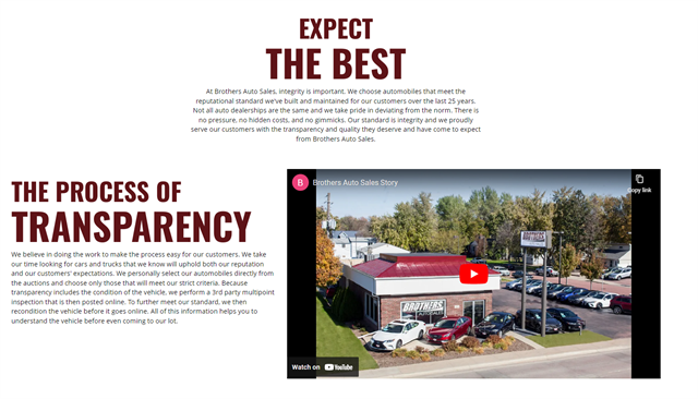 Brothers Auto Sales Has Been Serving South Dakota, Iowa, Minnesota, Nebraska and The Surrounding Area For Almost 30 Years! Please Contact Us For Your No Hassle Experience and Save Time In The Store By Starting The Process Online. We Look Forward To Taking Care Of Your Car Needs Today and In The Future! Free Carfax Report! Financing (WAC) and Vehicle Service Contract Options Available!